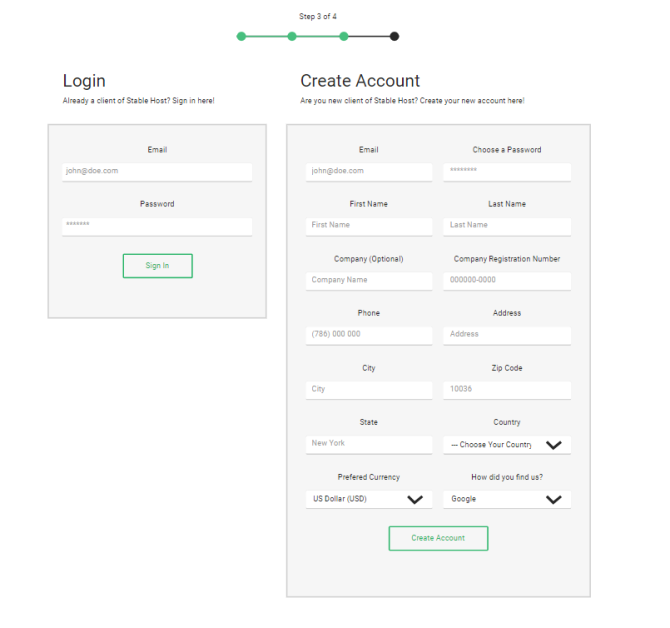 In the third stage, you’ll be asked to create an account with StableHost. Fill all the required information and click ‘Create Account:’